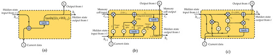 Comparison of RNN-based models: (a) simple RNN, (b) LSTM, and (c) GRU.
