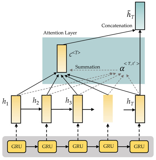 Once the GRU layer has computed the pre-processed data , we can derive the vector , where T denotes the length of the vector data X, and denotes the hidden state of the GRU at time step t. We can build the self-attention mechanism for the GRU using the following steps: