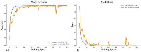 The accuracy and loss metrics of the CNN-GRU-AttNet model are illustrated in Figure 9. The graph in Figure 9a depicts the accuracy values for both the training and validation data. Notably, the model achieves convergence within a relatively short timeframe, specifically within 100 epochs. Additionally, Figure 9b demonstrates that the training loss exhibits higher values compared to the validation loss, which is a reasonable observation. This elevated training loss can be attributed to the multi-phase learning process aimed at understanding the distinct characteristics of CSI signals associated with various human actions.