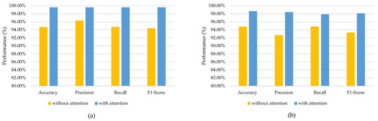 The ability to obtain an interpretable representation is crucial for many ML applications. While DL techniques excel at extracting features from raw data, understanding the relative importance of the input data can be challenging. This issue has been addressed in prior research through the introduction of attention mechanisms. In our study, we enhanced the classification algorithm by incorporating an attention mechanism originally designed for neural network machine translation tasks, as presented by Luong et al. [37]. This approach allowed us to develop an interpretable representation that highlighted the significance of individual input data segments within the model. The findings of our study demonstrate that the inclusion of the attention mechanism led to improved recognition effectiveness across all scenarios, as evidenced by the data presented in Figure 12. The CNN-GRU-AttNet model exhibited notable performance improvements on both benchmark datasets.