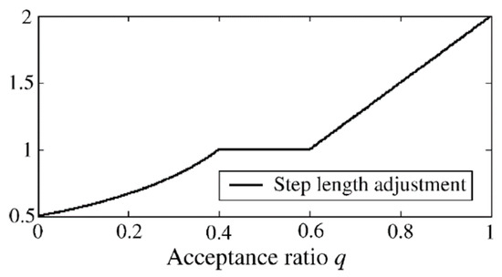 The change of the step length is adjusted by the parameter , whose value is usually set to 1 [23]. In Figure 2 ratio is plotted vs. acceptance ratio q.