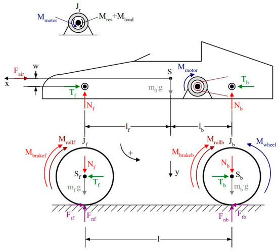 The applied simulation program [3] is based on the vehicle dynamics model presented in Figure 3 [3]. In the model, the car is divided into four structural units. These units are the driven rear wheels with the rotating machine parts connected to them (Unit 1), the freely rotating front wheels with the rotating machine parts connected to them (Unit 2), the body of the car including the stator of the electric motor (Unit 3), and the rotor of the electric motor (Unit 4).