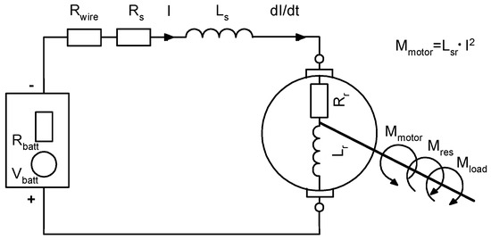 The meaning of the notations in Figure 3 and in Equations (9) and (10) can be found in the Nomenclature. To be able to simulate the electric motor, it must also be modelled. Regarding the prototype race car in [3], a series-wound DC motor was applied to drive the car. The developed model for this motor [3] is presented in Figure 4.