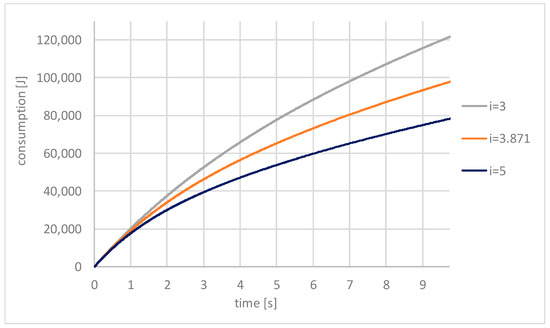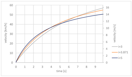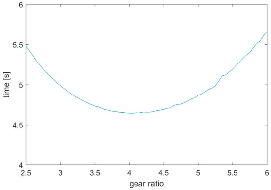 If we intend to optimize only one of the variables (for example, the gear ratio in the chain drive) then the objective function is a univariate function. Let the optimization problem be to find the optimal value of the gear ratio () at which a speed of 40 km/h can be reached by the race car in the shortest possible time (). In this problem the design variable is the gear ratio, and the objective function is function . Applying our simulation program, we calculate the velocity–time function of the vehicle at different gear ratios and read the time required to reach a speed of 40 km/h. After that, the above time is plotted as a function of the gear ratio (Figure 6), and then the approximate value of the optimal gear ratio, corresponding to the minimum time, is read from the graph.
