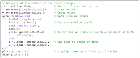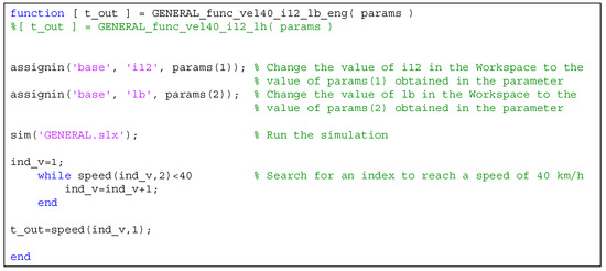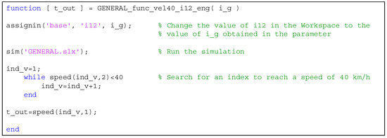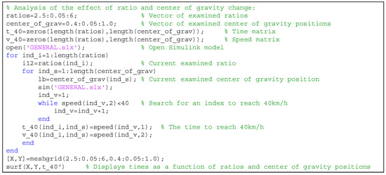 Regarding the first objective, good acceleration in the 0–40 km/h speed range is an important factor for driving on a racetrack with many sharp turns. (The top speed of the car is between 60 and 80 km/h, depending on the settings of the technical data.) To realize the optimization, regarding the first objective, first, it is necessary to create a MATLAB function that calculates the time required to reach 40 km/h speed at different gear ratios () and the position of the centre of mass () pairs. The program code that was developed for this is shown in Figure 13.