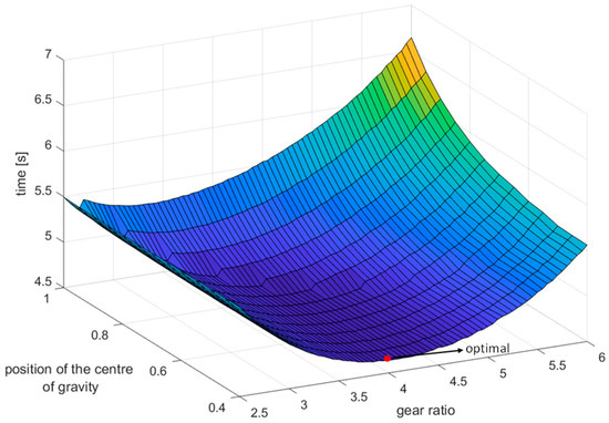 If we intend to optimize two of the variables, then the objective function is a bivariate function. In this case, the procedure presented previously for a univariate function can still be used. Let the optimization problem be to find the optimal values of the gear ratio and center-of-mass position () at which a speed of 40 km/h is reached by the car in the shortest possible time. Variable is the distance of the centre of mass of the vehicle from the rear shaft, and its value can be varied in the [0.4; 1] m range. Applying our simulation program, we calculate the velocity–time function of the vehicle at the different center-of-mass position and gear ratio pairs and read the time required to reach a speed of 40 km/h. After that, the above time is plotted as a function of the center-of-mass position and gear ratio pairs (Figure 8). Finally, the approximate center-of-mass position and gear ratio, corresponding to the minimum time, are read from the graph.