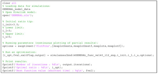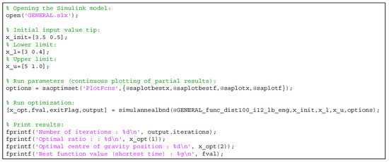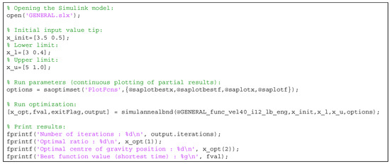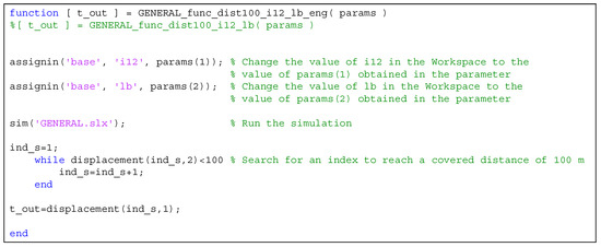 Regarding the second objective (drag race), for the optimization, first, it is necessary to create a MATLAB function, which calculates the time required for the car to travel 100 m at different gear ratio () and the position of the center-of-gravity () pairs. The program code developed for this is shown in Figure 16.