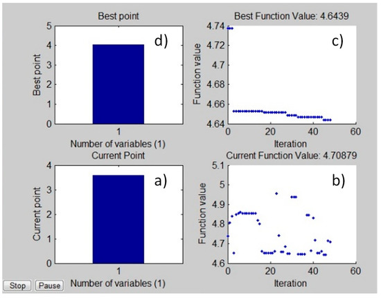 MATLAB windows for monitoring the parameter values in real-time. The first window (a) shows the current value of the gear ratio, the second one (b), the calculated times for the previously analyzed gear ratios, the third one (c), the smallest time vs. the number of iterations, and the fourth one (d), the optimal value of the gear ratio at which the time is minimum. At the end of the run, the optimal value is displayed in the MATLAB Command Window.
