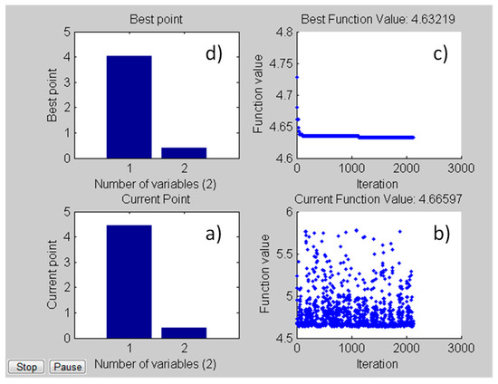 For three or more variables, or when greater accuracy is required, we can no longer use the graphical method, instead we can use the stochastic method simulated annealing (SA). To realize the optimization, we used the simulated annealing function (simulannealbnd) in the Global Optimization Toolbox within MATLAB, which based on the general method of simulated annealing, described in Section 2. The above-mentioned MATLAB function uses a variant of SA which is the adaptive simulated annealing (ASA) [16]. In this variant (ASA), the algorithm parameters that control temperature scheduling and random-step selection, are set automatically. The values of the above parameters in the traditional version (SA) are usually adjusted by the user, based on their own experience, as was previously mentioned in Section 2. This is a significant disadvantage of traditional SA compared to ASA. During the optimization we used the default settings in MATLAB, in which the step length equals the current temperature, and direction is uniformly random. The current temperature is calculated from the initial temperature applying the formula , where denotes the annealing parameter, which is the same as the iteration number.
