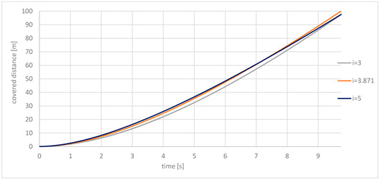 The simulation program presented in Section 3 can be used for optimization purposes in two ways: firstly, it helps to design a new vehicle. In this first case, only certain technical data (design parameters) have a given fixed value, for example, satisfying the competition rules. For the other technical data (design variables) we must find the optimal values, which are the most suitable for the given competition task (e.g., 100 m drag race). Secondly, it helps to prepare an existing vehicle for a given competition task. In this second case, we can vary or adjust only a few of the vehicle’s technical data. In both cases, using the simulation program and the optimization procedure, the possibility of successful racing can be significantly increased, and a lot of time and cost can be saved.