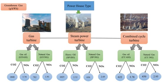 Consumption of the dryer energy is based on the fossil or electricity fuels (NG, HO, and GO). Therefore, various methods have to be explored to reduce energy use, and hence the emission of GHG. Regarding the climate of Iran, electricity is mainly produced in the PP using fossil fuels. Regarding the fact that Iran is one of the countries with the highest NG and HO resources, it is also one of the biggest producers of GHG. As all the PP of Iran are GT-GO, GT-NG, SP-HO, SP-NG, and CC-NG, the mean GHG emission (NOx and CO2) was determined for various types of plants with different fuels for the production of 1 kWh energy as depicted in Figure 1 [30].