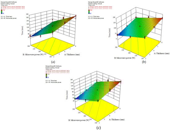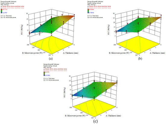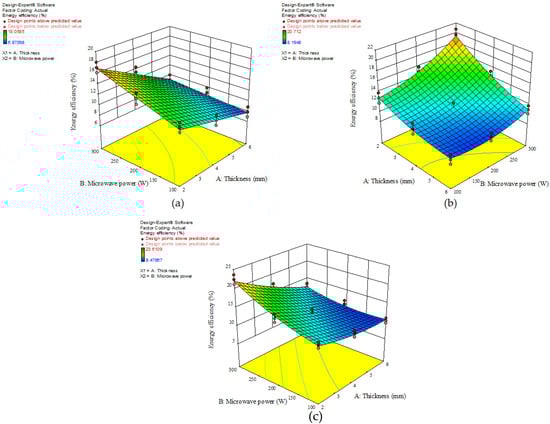 Response surface plots showing combined effect of microwave power and thickness on energy efficiency: (a) control, (b) ultrasonicated, and (c) blanched samples.