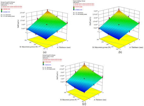 Three-dimensional counterplots for Deff against microwave power and thickness: (a) control, (b) ultrasonicated, and (c) blanched samples.