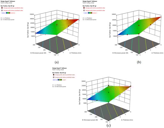 Response surface plots showing combined effect of microwave power and thickness on CO2 in GT-GO: (a) control, (b) ultrasonicated, and (c) blanched samples.