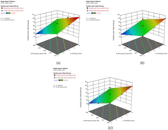 Table 3 lists the results of GHG modeling including CO2 and NOx for various MP and ST, as well as ultrasonication and blanching pretreatments using electricity from plants operating on diverse fuels. The R2 values were above 0.96. According to Table 3, the influence of the independent parameters was significant (p < 0.0001) on the emission of CO2 and NOx for all plants and their corresponding fuels. The second power of the independent parameters was only significant (p < 0.0001) on the emission of CO2 and NOx due to drying the control samples. Figure 6 and Figure 7, respectively, represent the interaction influences of MP–ST on the response variables of CO2 emission from a GT-GO plant and NOx emission of a CC-NG plant obtained based on the response surface diagrams for untreated and ultrasonicated and blanched samples. The highest CO2 and NOx emissions (29,414.5 and 162.5 g, respectively) were observed in the untreated samples with a thickness of 6 mm at the MP of 100 W dried by the electricity supplied from a GT-GO plant. However, the lowest CO2 (4279.7 g) was from a CC-NG plant in the drying of the blanched samples with the thickness of 2 mm at the MP of 300 W, while the lowest NOx emission (18.16 g) was related to the blanched samples with a thickness of 2 mm which were dried at the MP of 300 W of which electricity supply was a GT-NG plant. Regarding the obtained results, a rise in the MP and a decline in the ST decreased the GHG emission. Such a descending trend in the GHG emission can be assigned to the reduction in the SEC during drying at a high MP and thin thicknesses [56]. These findings are in line with the previous reports on the reduction of the GHG emission by increasing the MP for drying green pea [57], aloe vera [58], and Pistacia Atlantica [20].