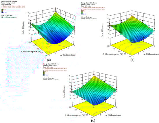 Relationships between microwave power and thickness with color-dependent variable: (a) control, (b) ultrasonicated, and (c) blanched samples.