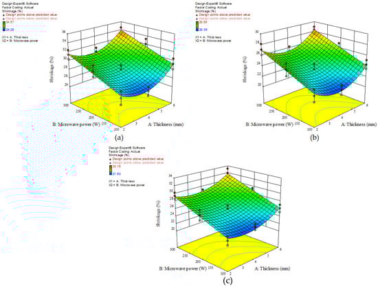 The effects of microwave power and sample thickness on response surface plots of the shrinkage: (a) control, (b) ultrasonicated, and (c) blanched samples.