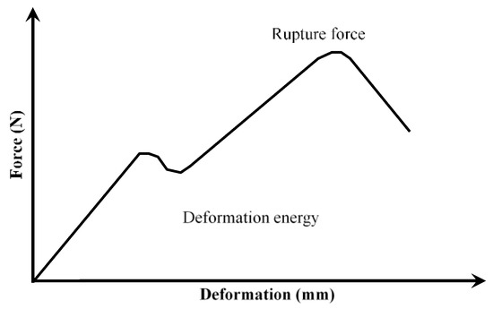A curve-ended cylindrical probe 5 mm in diameter was chosen to compress the fruit at a 10 mm min−1 loading velocity during all the tests [19]. The rupture force and deformation energy were found from the force-deformation graph recorded on the computer during the compression test. The area under the force-deformation graph represents the deformation energy, and the peak of the graph gives the rupture force (Figure 2).