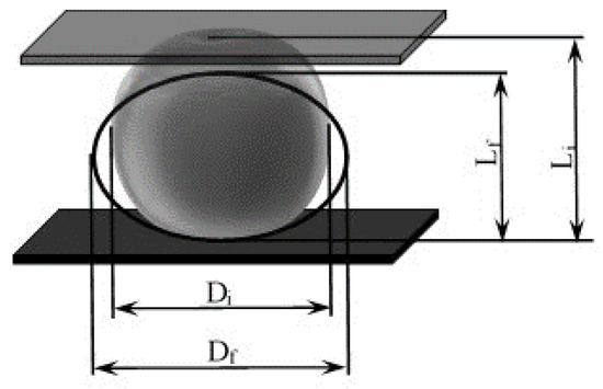 After measuring the initial length and width of the fruit, it was forced until deformation occurred on the fruit body (Figure 3). The Poisson ratio (λ) of the fruit was calculated by using the following formula by measuring the final diameter and length after deformation [16]: