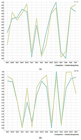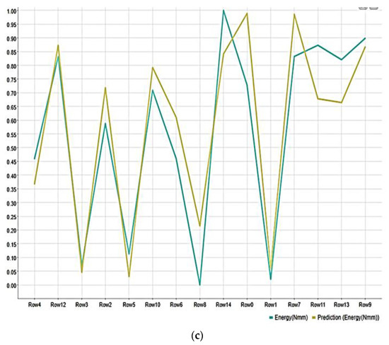 Figure 6 shows the scatter plot of the machine learning models used to estimate the deformation energy of the cherry tomatoes. In all three models, there is a positive and strong relationship between the actual value and the predicted results of the deformation energy of cherry tomatoes. As the value of one of the variables increases, the other increases and the points cluster near the line. Figure 7 shows the line plots of the models.
