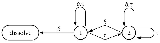 Assume that all membranes have a thickness of 1 in the initial grid (the rest of the paper also defaults to a membrane thickness of 1). If a rule is used in one of the membranes and produces the symbol τ, then the thickness of the membrane becomes 2. A membrane of thickness 2 can no longer be increased in thickness by another rule that produces the symbol τ and, furthermore, no object can pass through it. If the rule that produces the character δ occurs in a membrane of thickness 2, then the thickness of that membrane becomes 1, therefore, the membrane is permeable in the next step. If the rule produces both δ and τ in the same membrane and in the same step, then the thickness of the membrane remains unchanged. The cumulative effect of δ and τ is shown in Figure 2 (the numbers in the two circles indicate the thickness of the membrane).