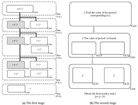 The execution of the system can be divided into two main phases: the first phase is the splitting of the sub-task membranes for computing different a , and the second phase is the execution flow for computing the membranes corresponding to a certain a, as shown in Figure 3. In the first stage, a new submembrane is generated every two-time slice, and in this submembrane, a certain object corresponds to a different value of a (e.g., in Figure 3a, d3 represents the membrane corresponding to a = 3 in this membrane). The second stage is to find a period r corresponding to a by splitting the computational membrane in the membranes corresponding to the different values of a generated in the first stage. When a matching period r is found, and are calculated and the two sets of maximum conventions are also calculated by creating new GCD membranes, respectively, and the result obtained is the final decomposition. It is important to note that the execution of the rules in the membranes corresponding to the different values of a do not interfere with each other (only when the final result is computed in the membrane corresponding to a certain a does the membrane release an abort signal and, thus, the whole system stops working). In other words, the execution of the system is parallel. We will show this process in detail next.