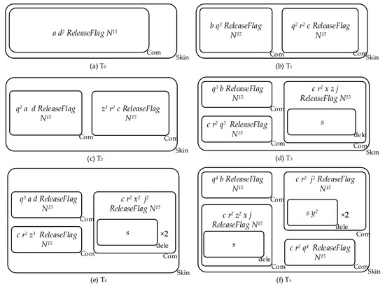 At T0, as shown in Figure 5a, the only objects in the membrane are a d2 ReleaseFlag N15. At the moment of T1, the execution of the rules a → [b] [c,r2] and d → q cause the membrane to split a new membrane as shown in Figure 5b. At the moment T2, the rules b → a d and q → z|c r are executed and the objects in the membrane are shown in Figure 5c. Then, at the moment T3, the rules d → q, a → [b] [c,r2], c z → c x j Delegate:delegate{s} are executed and a new membrane is split, while a new delegate membrane containing the object s is created in the first split membrane as shown in Figure 5d. At the moment T4, b → a d, q → z|c r, c z → c x j Delegate:delegate{s} is executed again, and the result is shown in Figure 5e. Then, at the moment T5, the execution of rules a → [b] [c,r2], d → q makes a new membrane split again, and the rule x → (y, in all)|!z is executed in the first split membrane, as shown in Figure 5f.