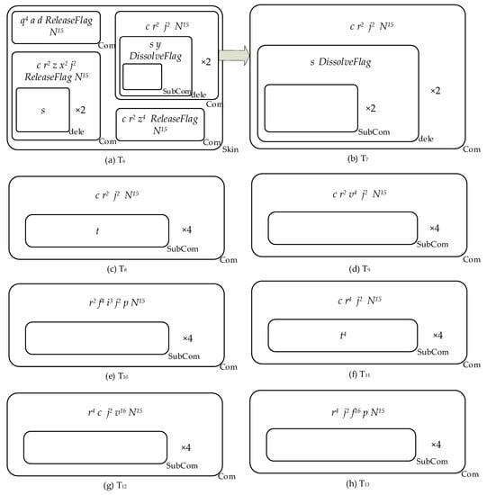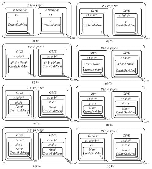 Since each computer membrane is operating in parallel, in order to save space, in the following pages we only show the computer membranes that were split for the first time, that is, the membrane corresponding to a = 2, as shown in Figure 6b. It shows that at time T7, the execution of the rule s y → s SubCompute:subComputee{} causes a subComputee submembrane to be generated again. At time T8, the rule s DissolveFlag → (t, in all)|!y in the delegate membrane class executes the generated object t into the submembrane and dissolves the delegate membrane. At the same time, the four submembranes (subComputee membrane) enter their parent membrane (Computer membrane), as shown in Figure 6c. At time T9, the rule t → (v, out) in the subComputer membrane class is executed, as shown in Figure 6d. Then at time T10, the rules v c → p f, 1 and v → i f, 3 are executed, as shown in Figure 6e. At time T11, the rules p → r2 c|i, 1, f → (t, in all) |i, 1 and i → λ are executed, as shown in Figure 6f. Then, at time T12, as shown in Figure 6g, the rule t → (v, out) in the SubComputer membrane class is executed, and the object t4 in the four submembranes enters the parent membrane, and the obtained v16 is realized computes the value of (a2)2.