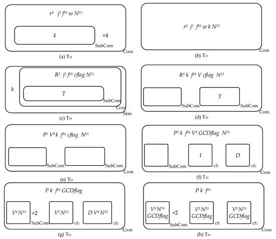 Next, at time T17, the rule r2 → R|h is executed. At time T18, the rule R h → cFlag|!cFlag is executed. At time T19, the rule j cFlag → cFlag SubCompute:subCompute{T} is executed to generate a new subCompute submembrane. At the same time, an object k will be generated in other Computer membranes (not shown here) and enter the Skin membrane, as shown in Figure 7c. At time T20, the rule T → (V, out) is executed, and at the same time the rule k → (k, in all) in the Skin membrane, 1 is executed, sending k to all submembranes, as shown in Figure 7d. At time T21, the rules T → (V, out) and R cFlag → rFlag|!j are executed. At time T22, the execution of the rule V → P (T, in all)|rFlag sends the generated T2 to all sub-branes. Then, at time T23, the rules P rFlag → cFlag and T → (V, out) are executed, and the generated V4 is sent to the parent membrane, as shown in Figure 7e. Then, at time T24, as shown in Figure 7f, the rule cFlag → GCDFlag CalculateFactor:cf1{I} CalculateFactor:cf2{D}|!R,!r,1 creates two cf1 and cf2 submembranes. At T25, the rules V → (V, in all)|GCDFlag,2, N → (N, in all)|GCDFlag,2 and the rule I → V, 1 in the CalculateFactor membrane class are executed, as shown in Figure 7g. At T26, the rule GCDFlag → (GCDFlag, in all)|!V !N,3 satisfies the execution conditions and enters into all submembranes and the rule D V → λ in the CalculateFactor membrane class is executed, as shown in Figure 7h.
