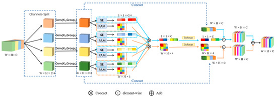 • Output module results. The four feature maps obtained in Step 2 are spliced in the channel dimension to form a multi-scale feature map, X’. Then, the corrected attention vector and pixel-attention-mask map are applied to the feature map X’, respectively. Next, the two feature maps with attention weights are summed, and the result obtained is used as the final output of the SEPAM module.