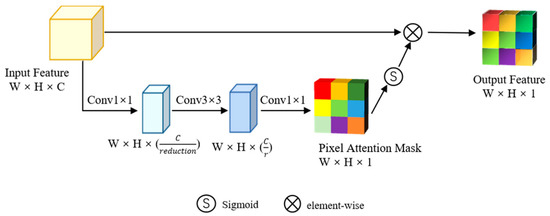 First, a W × H × C input-feature map is implemented through a 1 × 1 convolution to achieve a dimensionality reduction operation, and a W × H × (C/r) (r is a reduction factor) feature map is obtained. This process not only adds more nonlinear processing, but also fits complex correlations between channels. Next, a 3 × 3 convolution is used to further learn features, and a 1 × 1 convolution used to focus on the features compression obtains a W × H × 1 feature map. Then, the sigmoid layer is used to map the compressed one-dimensional features between (0, 1) and, finally, obtain a W × H × 1 pixel-attention-mask map, where the value of each pixel position represents the pixel at that position level of attention. Then, the element-wise operation is performed on the input-feature map of W × H × C and the pixel-attention-mask map of W × H × 1 to provide the feature map with pixel-level attention and to identify the features that need to be paid attention to in the image data. Useful features are increased and useless features are weakened to achieve the effect of feature screening and enhancement and to better learn critical features. The PAM attention-masking process is shown in Figure 4. This module can improve network performance and enable the network to understand and utilize pixel-level feature information more accurately.