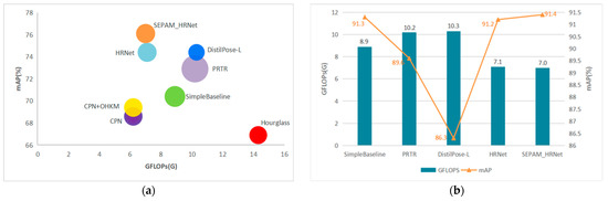 In Figure 6a, the vertical axis represents the accuracy rate, the horizontal axis represents the computation amount, and the circle size corresponds to the model’s parameter amount. It can be observed that the SEPAM_HRNet model proposed in this paper outperformed the recent human pose-estimation model, in terms of accuracy.