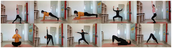 In order to adapt to a universal yoga scenario, this study created an indoor human yoga pose-characterization dataset, YOGA2022, for modeling experiments. The dataset contains ten types of yoga poses: Warrior I, Warrior II, Bridge, Downward Dog, Flat, Inclined Plate, Seated, Triangle, Phantom Chair, and Goddess. Each pose was captured in an indoor environment, as shown in Figure 7. During data collection, the camera captured video clips of left and right direction movements and frontal movements performed from the side or front. The production of this dataset provides an important reference resource for the teaching of yoga and the development of models for human pose estimation. The data-acquisition steps were as follows: