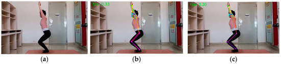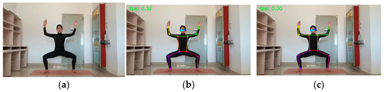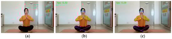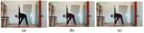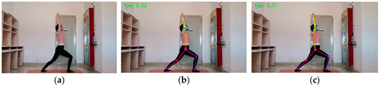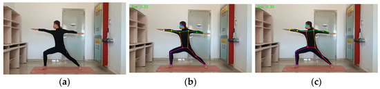 Figure 8. Warrior I: (a) original picture; (b) HRNet prediction; (c) SEPAM_HRNet prediction. For the prediction of unobscured limb keypoints, the predictions of the two models were similar.