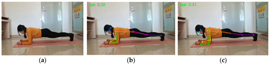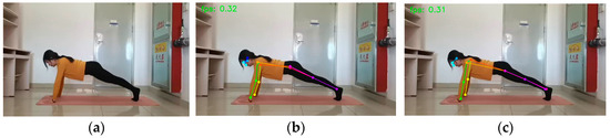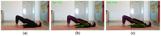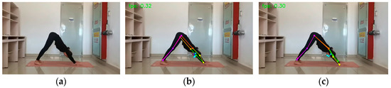 Figure 14. Downward Dog: (a) original picture; (b) HRNet prediction; (c) SEPAM_HRNet prediction. The SEPAM_HRNet model performs more accurately in predicting occluded keypoints.