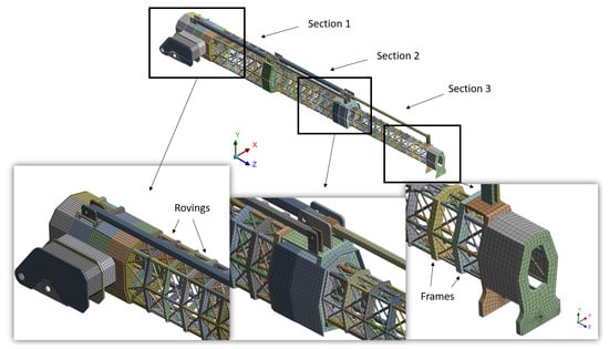The CM boom consists of three sections. The first section consists of 11 frame spacings, the second of 15 frame spacings, and the third of 17 frame spacings. The developed FE model of the CM is shown in