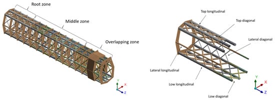 Table 1 were implemented. For top diagonal and low diagonal rovings within each of the zones, a separate parameter was used to describe diameters. Lateral longitudinal rovings were supposed to have a diameter per length zone. Top longitudinal and low longitudinal rovings were characterized by a parameter per frame spacing within the middle zone, and a parameter per length zone within the root zone and overlapping zone. Thus, the number of parameters was reduced by a factor of 7 from 465 to 67.