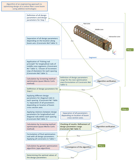 13] present methaheuristic algorithms for solving optimization problems of truss structures. However, there is no algorithm that could be used for efficient optimization of the entire crane boom structure. The use of the considered algorithms and methods to solve the optimization problem for such structures is difficult due to the large number of variables, unknown parameter correlation functions, several calculation cases, and the large number of additional constraints and dependencies imposed by the production technology.