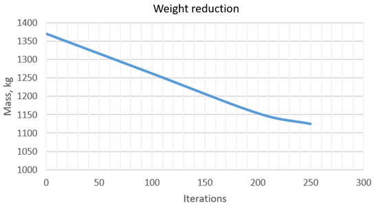 Considering rather large number of parameters, finding the absolute minimum of the objective function may be extremely time-consuming and is not usually set as a practical goal. In engineering practice, a weight reduction of 18% is usually considered as a satisfactory one. Further weight reduction in the studied case leads to a dramatic increase in the required number of iterations, and is not thought reasonable.