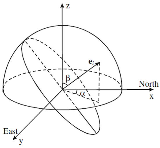 The occurrence of random discontinuities of rock mass are usually represented by two random variables of dip direction α (0 ≤ α ≤ 360°) and dip angle β (0 ≤ β ≤ 90°). The actual field investigation of rock discontinuity is also described by measuring the dip direction and dip angle of discontinuity. The dip direction of the discontinuity represents the inclined orientation of the discontinuity in space. Generally, the north is set to 0°, and the angle between the clockwise rotation and the north is the inclination value, which ranges from 0° to 360°. The dip angle is the angle between the discontinuity and the horizontal plane, and its value range is 0°–90°. Assuming that the discontinuity is a plane, its occurrence can be expressed by the unit normal vector of the discontinuity. As shown in Figure 1, the positive x and y axes represent the north and east, respectively, and the positive z axis is vertically upward. Through geometric analysis, the expression of the unit normal vector of the discontinuity is ei = (xi, yi, zi) [34,35], where