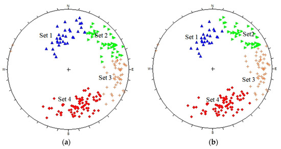 The widely distributed discontinuous structural planes in rock masses cause the rock masses to have strong discontinuity, heterogeneity and anisotropy [1,2]. The randomness and uncertainty of rock discontinuities will affect their deformation, strength, permeability, stress–strain behavior and failure mode [3,4]. The discontinuities of rock masses in natural states have the characteristics of grouping. The grouping of random discontinuities is the basis of characterizing the distribution law of discontinuities, and it is also a prerequisite for the calculation and simulation of random jointed rock mass and the evaluation of rock mass stability. The analysis results have very important practical significance for the selection of rock mass strength parameters, the study of mechanical properties and the evaluation of engineering stability [5,6,7,8,9]. Engineers try to delineate discontinuities into subsets based on similar orientations when interpreting discontinuity data.