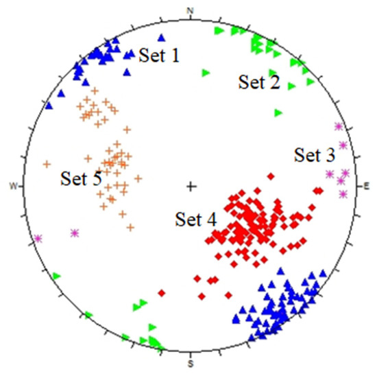 Using the discrete fracture network (DFN) method [45], four groups of 220 random discontinuities were randomly generated and their occurrences obeyed the standard normal distribution. Table 1 shows the specific parameters, with which a randomly generated discontinuous surface equal area upper hemisphere pole map was drawn, as shown in Figure 4.