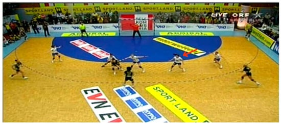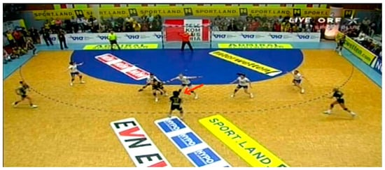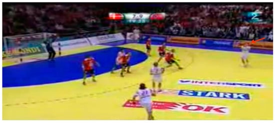 Videos were selected by two handball coaches concerning two different game sequences with increasing difficulty. The situations were related to offensive/defensive sequences in unbalanced conditions of opponents and teammates. The temporal occlusion paradigm was used to stop the sequence before the final action was performed [17,30,31,32]. Athletes were asked to examine the game sequences to anticipate the possible next adequate actions related to a player indicated in the video with a red arrow. Two coaches independently selected videos from international handball competitions and extracted offensive or defensive game sequences. The selection criteria were related to (1) offensive or defensive game sequences, (2) unbalanced conditions of teammates or opponents, and (3) multiple options of available responses. Therefore, two game sequences were selected: the first game sequence was selected from the match played by Hypo Niederösterreic (Austria) vs. Lada Togliatti (Russia) during the 2007/08 Women’s EHF Champions League; the second sequence was selected from the match played by Denmark vs. Norway (i.e., national teams) in the 2008 European Men’s Handball Championship held in Norway. For each game sequence, an offensive and a defensive player was indicated with a red arrow in the frame preceding the final stage. Then, two images of the same video were shown separately to the sampled players, one related to the offensive player and one related to the defensive player (see Figure 1, Figure 2, Figure 3 and Figure 4 for more details). The second video was more complex due to the greater number of potentially available responses.