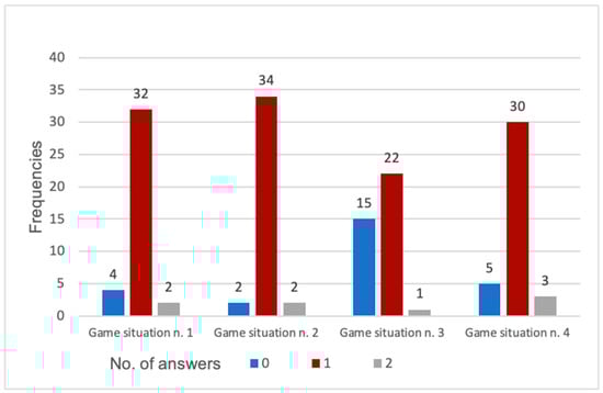 Figure 5 shows, for each game situation, the frequency of answers provided by the athletes. First-tier athletes always provided at least one answer in game situations one and two; in game situation three, the same players provided only one answer, while in game situation four, three of them provided two answers.