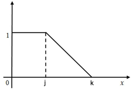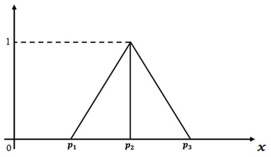 A linear triangular fuzzy number denoted as can be represented with the following definition of its membership function []. Figure 2 shows a graphical representation of linear TFN along the x and y-axis.