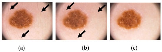 Illustrates the pre-processing of a skin lesion, showcasing the following stages: (a) the original dermoscopic image (arrows shows hairs on skin lesion), (b) the removal of hair using the Dull Razor algorithm (arrows reflect to same points where hairs are removed digitally), and (c) the image enhancement achieved through histogram equalization (the contrast of the lesion is increased and the outer skin is brightened in this enhanced image such that a visual distinction between skin and malignant lesion can be drawn).