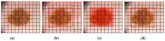The classification process performed by YOLO is depicted using a skin lesion image, where (a) represents the input grid of size M × M. In (b), bounding boxes are generated based on the confidence score. (c) illustrates the mapping of class probabilities, and (d) shows the detection of the lesion.