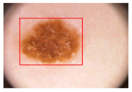 In the proposed algorithm, all dermoscopic images with varying resolutions are resized to 512 × 512 pixels before undergoing the training process. This resizing step is performed to reduce computational usage. The YOLO classifier is trained using the reshaped dataset with the following parameters: a batch size of 64, a subdivision of 16, a decay rate of 0.0005, a momentum of 0.9, a learning rate of 0.001, and 50,000 epochs. The weights of the classifier are saved after every 10,000th epoch to ensure efficient location detection of dermoscopic lesions. The trained classifier is then utilized to test the proposed algorithm, where the output from the last sub-stage of segmentation serves as input for the classifier to detect the lesion. Figure 9 demonstrates the detection process of the classifier, which identifies malignant lesions and forms bounding boxes around them, enabling the precise location detection of melanoma lesions.