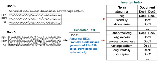 In an information retrieval system, indexing a sentence can be easily implemented using an inverted index [13]. However, because the EEG signal is a continuous value, it is difficult to directly index it into an existing database and use search engines, such as Lucene [2] or Elasticsearch [3]. Therefore, this work proposes a text generator for the signal. Once the signal is described by the generated text, it can be stored using a word-level inverted index [14]. For example, as depicted in Figure 2, the signals named Doc 1 already have an impression reported by neurologists, stating “Abnormal EEG. Excess drowsiness. Low voltage pattern”. However, the signals named Doc 2 do not have any report yet. Thus, the goal of this research is to generate an associated report that precisely describes the signal using our text generator and to apply an inverted index using a tokenizer, such as a one-gram or bi-gram tokenizer. To achieve this goal, this work introduces a text generator for word-level inverted indexes that combines convolutional neural networks (CNNs) borrowed from DeepSleepNet [11] and a transformer [12].
