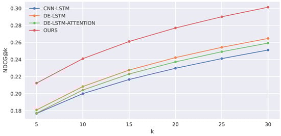 Additionally, in order to ensure the validity of the retrieval performance, the proposed method in this work was compared with each baseline using a t-test. The p-values obtained from the t-test for CNN-LSTM, DE-LSTM, and DE-LSTM-ATTENTION are 0.0174, 0.0377, and 0.0116, respectively. Therefore, the proposed method in this paper significantly outperforms the retrieval performance of the baselines.